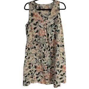 a J. Jill sleeveless dress featuring a floral print. Sleeveless A-line dress with a V-neckline. Features a multi-colored floral pattern, primarily in shades of pink, green, and cream/off-white, with dark green leaves.  Made with lightweight fabric, suitable for warm weather.