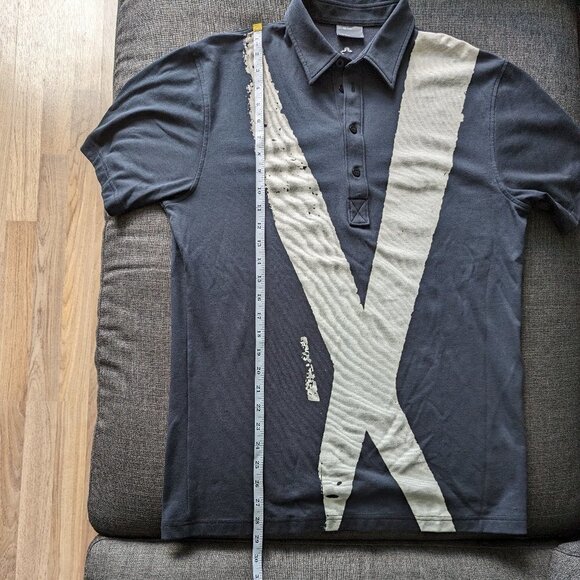This J Lindberg golf polo features a black background with cream burnout x pattern across the chest. In very good used condition, there are no noted flaws, just some light overall signs of wear / washing.