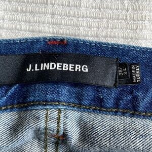 These J. Lindberg Distressed Jeans are in good, pre-owned condition. Relaxed leg with intentional whiskering on the front. 100% cotton, made in Turkey. Size 38 waist - please see pics for approximate measurements.
