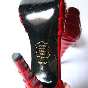 Unique red patent leather peep toe heels by J. Loren Collection. Folded patent leather on toes and heel make these shoes stand out and give it a bit of a retro feel! Women's size 8 with a 4" heel. Pre-Owned but gently used with minimal signs of wear on soles and around inside heel are (see last picture). There is one tiny black scuff on outside of right shoe but hardly noticeable (see second last picture). Smoke-free, pet friendly home!