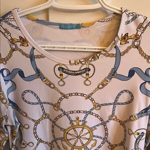 J. McLaughlin Gold and White Nautical 3/4 Sleeve Cruisewear Top, size M
