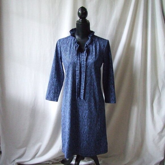 J. McLaughlin dress. Jaclyn style. Pull over, 3/4 sleeve with bow tie and ruffle at the collar. Below the knee length. Black and blue tree bark like stripes. Unlined. It is marked a size medium. 91% nylon and 9% spandex. Stretchy! New with tags.