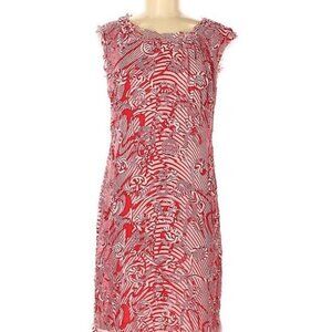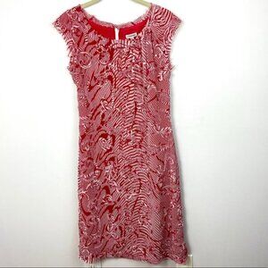 Red and White Swirl Dress by J. Peterman. Women’s size 6. Midi length. Polyester. Fully lined. Dry clean. Fringe detail. Crew neckline. Cap sleeves. Back zipper closure.
