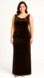 Elegant evening gown with rich texture and a striking gold accent.
