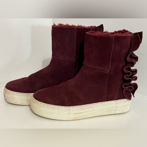Super cute dark burgundy suede leather booties. Fuzzy lining and zipper up the back with grippy rubber sole. Super cute alternative to Uggs. Great with a mini skirt for spring.