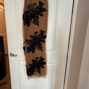 Size small : has side zip and slit : never worn with tags : black sequin embroidery front and back : nude mesh skirt : lined