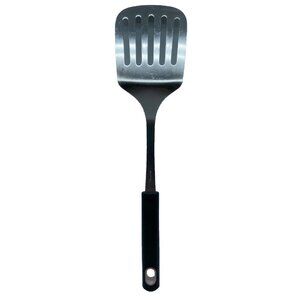 The JA Henckels spatula features a durable metal construction with a sleek black handle, perfect for all your cooking needs. This vintage 1990s piece is a must-have addition to any kitchen, offering both style and functionality. The spatula is dishwasher safe, making clean-up a breeze, and its 12-inch size provides ample reach for flipping, stirring, and scraping. Add this high-quality utensil to your collection for a reliable cooking experience every time.
