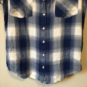 JACHS Girlfriend Blue & White Plaid Rolled Cuff Button Down Rayon Shirt