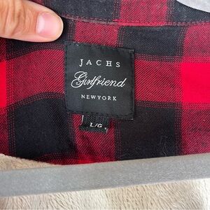 Cozy and rugged, this JACHS Girlfriend buffalo plaid shirt jacket in a classic red and black check is lined with ultra-soft sherpa fleece for extra warmth. Features snap button front, flap chest pockets, and a relaxed fit. Size large. Ideal for layering on chilly days, whether you’re heading to a cabin or just love that cozy lumberjack look.