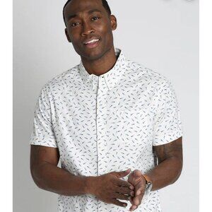 Made from 98% cotton, this bright white shirt features a unique blue feather design, perfect for standing out on the course.