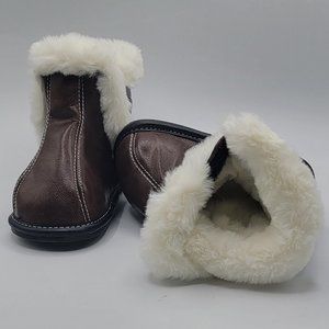 Keep those little toes and feet toasty in the cooler weather. Sherpa lined with a stripe of sherpa trim. Brown vegan leather.