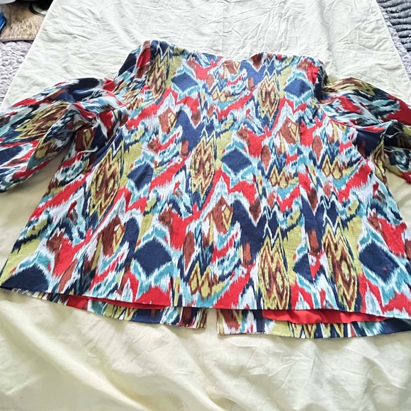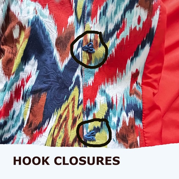 JACKET, MULTICOLOUR (Red, Navy, Yellow, etc.), SZ 28W, NO COLLAR, ¾ SLEEVES, HOOK & EYE CLOSURE, FULLY LINED, WOOD & METAL EMBELLISHMENTS, JOAN RIVERS, IN BAG, TAGS ON, NEVER WORN