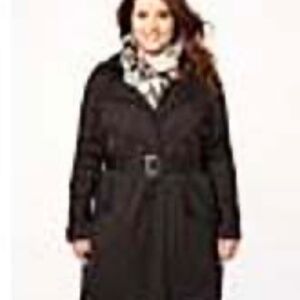 JACKET, TRENCH COAT, BLACK, SIZE 4X, REMOVABLE HOOD, BELT, SIDE POCKETS, FULLY LINED, RAGLAN SLEEVES, SINGLE BUTTON CLOSURE, ADDITION ELLE, TAG ON,