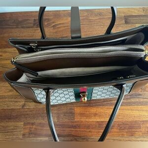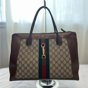 Elegant Gucci tote with signature monogram pattern. Features brown leather accents and green-red stripe detail. Perfect for everyday use.