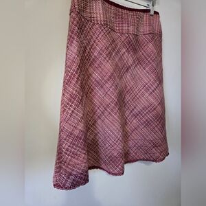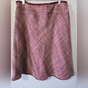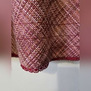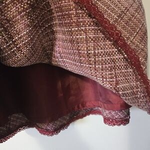 Adorable burgundy midi skirt. Lightweight, tweed style with a delicate lace hem. Side zipper and hook closure