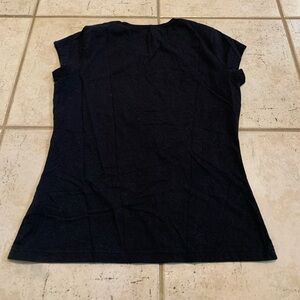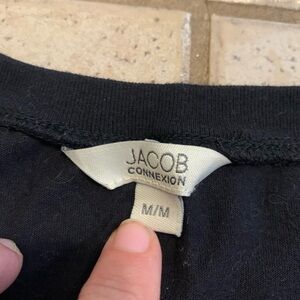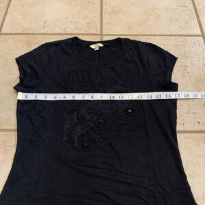 Elevate your casual style with this stylish black t-shirt from JACOB Connexion. Featuring a unique beaded circular design on the front, this top adds a touch of subtle sparkle to any outfit. The fabric is soft and comfortable, making it perfect for everyday wear. The shirt is in great pre-owned condition with no visible flaws.