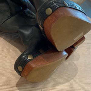 These black Jacquemus 70 leather clog boots are designed in knee-high silhouette and feature a pull-on style, square toe, antiqued gold tone studs, wooden platform sole and 70 mm block heel. Posts about Simon’s cult accessories have been clogging up your social media feed for a while now, and with good reason. Kick back and watch the likes come rolling in on the pics of your new Jacquemus boots.