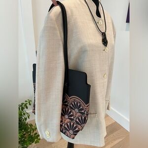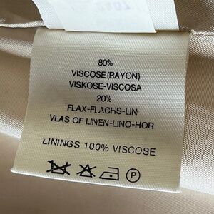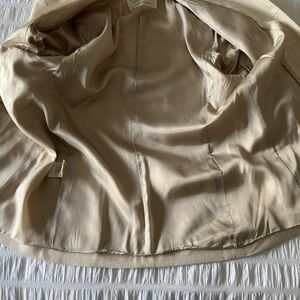 Vintage Jaeger long beige jacket has shoulder pads, is fully lined, button front, buttons on cuffs, front pockets short stand up collar. 80% viscose/ 20% linen blend.