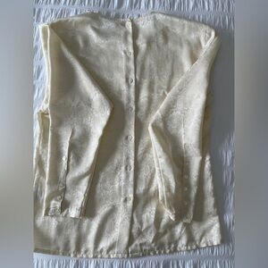 Jaeger blouse made in Great Britain features a floral jacquard pattern. Neutral cream colour. Unique style can be worn with the buttons up the back or in the front. Each sleeve has 5 small buttons, decorative, they do not unbutton.Missing fabric tag, but I would say this is polyester.
