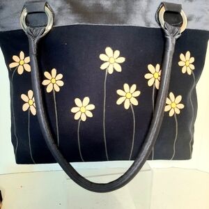 JAKS Hand painted Daisies on Navy Blue Canvas and Satin Handbag