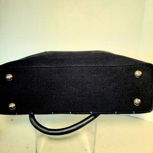 Absolutely gorgeous bag Beautiful construction and design. Silver hardware Footed. Satin lined and Satin handles with 10 inch drop. Bag measures 11 x 10 x 3.5 inches