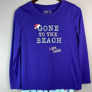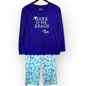 Gone to the Beach. Love Santa. Light aqua blue printed elastic waist straight leg bottoms with printed starfish and Santa hats.