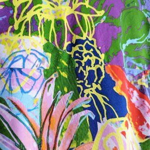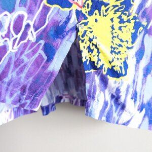 100% Rayon, colourful burst of colours with abstract 'scribbles' of floral and fruit (?) The print is called 'Fruitopia'. Made in Hawaii. Lapel collar. Very lightweight.