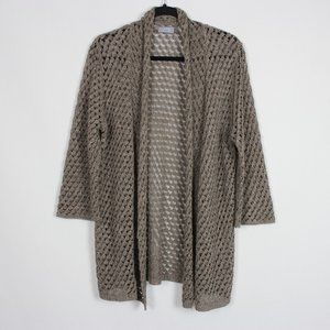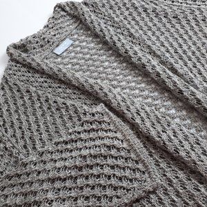 This cozy cardigan comes in a beautiful neutral taupe shade. Made in a loose crochet style, it's perfect for breezy days or layering up. With its half sleeves and roll shawl collar, it's designed to be both stylish and comfortable. Perfect for spring and summer. Great condition.
