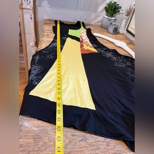 Color block sleeveless dress in black with bold geometric patches of green, yellow, and orange print. Flowy A-line silhouette with subtle floral motifs along the hem. Lightweight and comfortable with lots of movement.