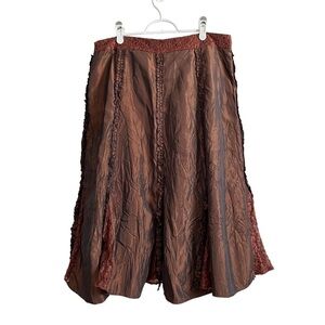 Jane & John by Mode Tricotto Gorgeous unique midi skirt with a shimmery copper brown fabric. Lace at waist and bottom hem with vertical ruffled fabric details. Lined.