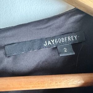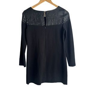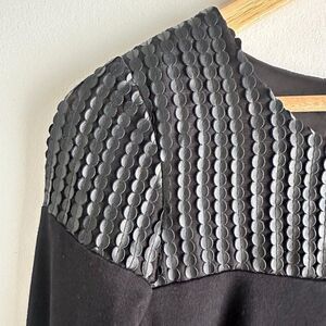 In excellent condition. JayGodfrey black, long sleeve mini dress. This dress has black faux leather trim on the chest and shoulders that creates a polka dot look. Shift style with some lycra in the fabric for a comfortable fit with a short length. Zipper and button closure on the back. This is a perfect dress for a night on the town! Flat lay measurements: 16" pit to pit, 31" length.