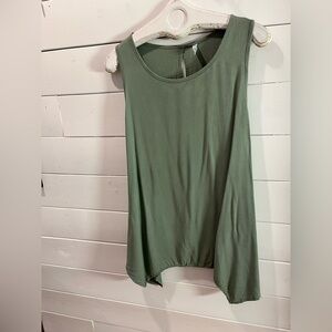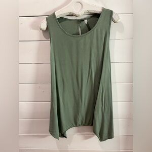 Chic and versatile sleeveless blouse in a soft green shade. Features a flowing cut with an asymmetrical hemline for a flattering drape, scoop neckline, and back keyhole detail. Made from a light stretch fabric for comfort and ease of movement. Perfect for layering or wearing on its own in warmer weather.