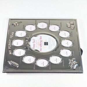 Sweet silver plated baby portrait / picture frame, with space for a picture every month. With some marks to the plating, and the little strut no longer attached to the backing board (stands just fine without it being attached)