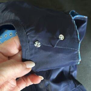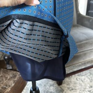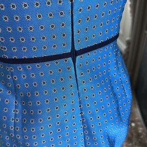Beautiful fully lined JCrew dress. Very professional looking. Wonderful detail of navy trim on a royal blue printed body. Size 0P invisible 20β zipper 16 1/2β pit to pit Waist to hem 19β Waist 13β flat. Snap at shoulder to keep bra strap in place. Polyester and Elastin body, 100% poly lining