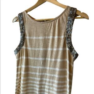 J CREW Silk Sequin Trim Tan & Silver Stripe Cotton High Neck Sleeveless Top S