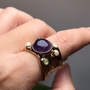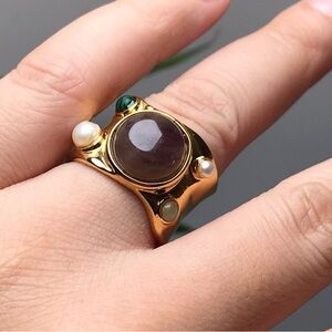 The ring face is made of natural stone. Wide, gold-plated brass ring, 1.5cm wide. The edge is made of malachite, an unidentified green stone,