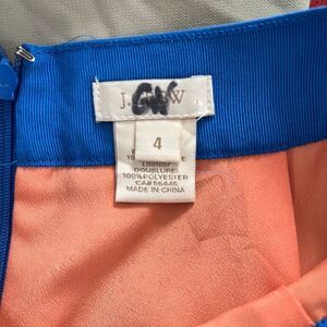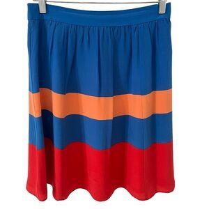 J.Crew, A-line silk skirt, 100% silk, Spring/Summer 2012, style #82416, striped pattern, horizontal color block design, blue red orange stripes, colorful skirt, lined skirt, lightweight silk, elegant texture, flowy silhouette, back zipper closure, hook and loop fastening, classic A-line cut, flattering fit, vibrant design, summer fashion, spring style, breezy skirt, polished casual, timeless J.Crew piece, statement skirt, premium fabric, versatile wardrobe staple, vintage J.Crew, collectible fashion, soft and smooth feel, refined style.