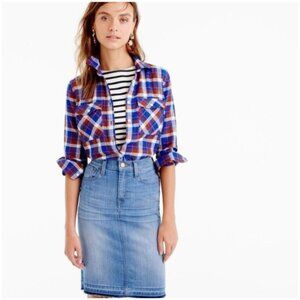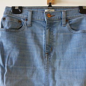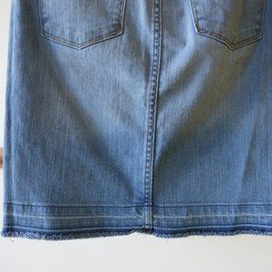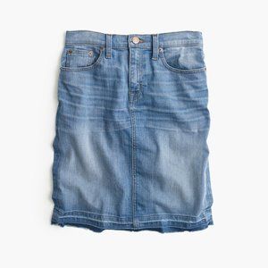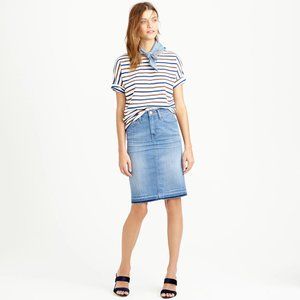 J. CREW Doran medium wash blue denim frayed hem whiskered pencil skirt in a 5 pocket style.