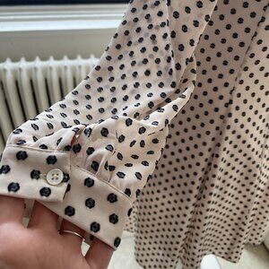 Delicate polka-dot dress from the prestigious brand J.Crew. Features flattering pleats and an elegant front slit with a button closure. Slightly sheer sleeves and bodice. Made of viscose and polyester.