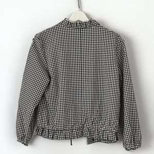 Ruffle-neck bomber jacket in navy / ivory gingham. Lined in cotton.