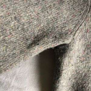 Cute grey turtleneck with colourful speckles. Dark speckle in fabric (not a stain/pull - see photo 5). Some slight piling, hardly noticeable (see photo 8). I would say this sweater fits more like a SMALL.