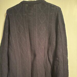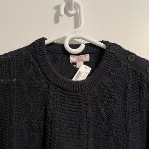 NEW. w/tag. Wallace & Barnes (JCrew) Navy blue. Sz. M. UNISEX cable-knit crewneck sweater in 100% washed cotton - 3 button on left shoulder. Chest = 40 in. Waist=36 in. Sleeve length = 28 in. Back neck length = 27 in Note: models wearing different colours.