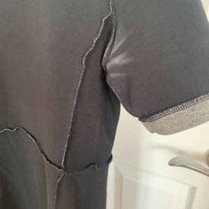 Grey office dress with black panels, hidden back zip. Short-sleeved, knee length. Size 2. Cotton/wool/nylon/spandex blend. Very good condition, minor wear at underarms. Dry Clean only.