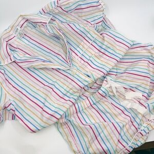Stay comfy and stylish in this lightweight J.Crew pajama set, size XS. Made from 100% breathable cotton, this set includes a button-down short sleeve top with chest pocket and matching drawstring shorts. The colorful rainbow stripe print adds a fun and cheerful touch—perfect for lounging or sleeping year-round.