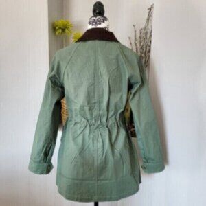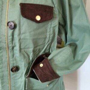 green with dark brown Corduroy trim featuring point collar, military-inspired pockets & snaps (single chest pocket, dual side flap pockets), concealed zipper with button front closure, adjustable
