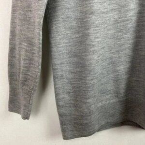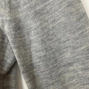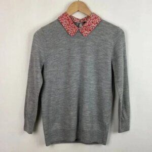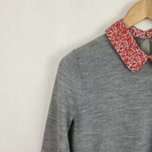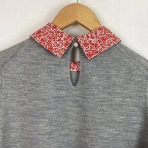 J.Crew Tippi Sweater - Heathered Gray - Red & White Floral Collar - Liberty Camomille Print - 100% Merino wool + 100% Cotton Collar - 3/4 Sleeves - Good preloved condition - 3 Small holes on front right sleeve & back right shoulder (pics 10 & 14) - Mended by professional seamstress - Minor Pilling - See pictures for details - Size Small