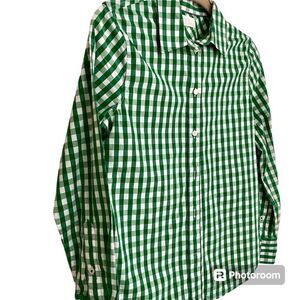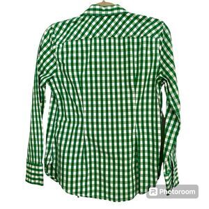 Kelley green and white shirt, has darts. Two stock photos with model are not the exact shirt. This shirt is more of a square style, not as fitted. This is in very good pre- owned condition.