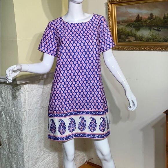 In excellent preowned condition, virtually as new, gorgeous short sleeve shift style dress from J.Crew in stunning Bagru Dabu print.