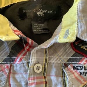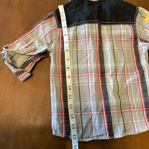 Button up plaid shirt. Can be worn sleeves down or rolled up with a strap to hold them up. Patches on sleeve and on front of shirt.