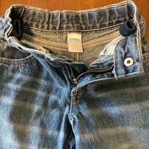 Gymboree jeans with adjustable elastic waist, front & back pockets, snap & zipper fly. Has distressed look